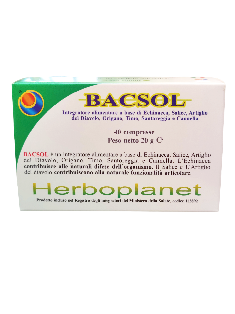 BACSOL é un integratore alimentare a base di Echinacea, Salice, Artiglio del Diavolo, Origano, Timo, Santoreggia e Cannella.