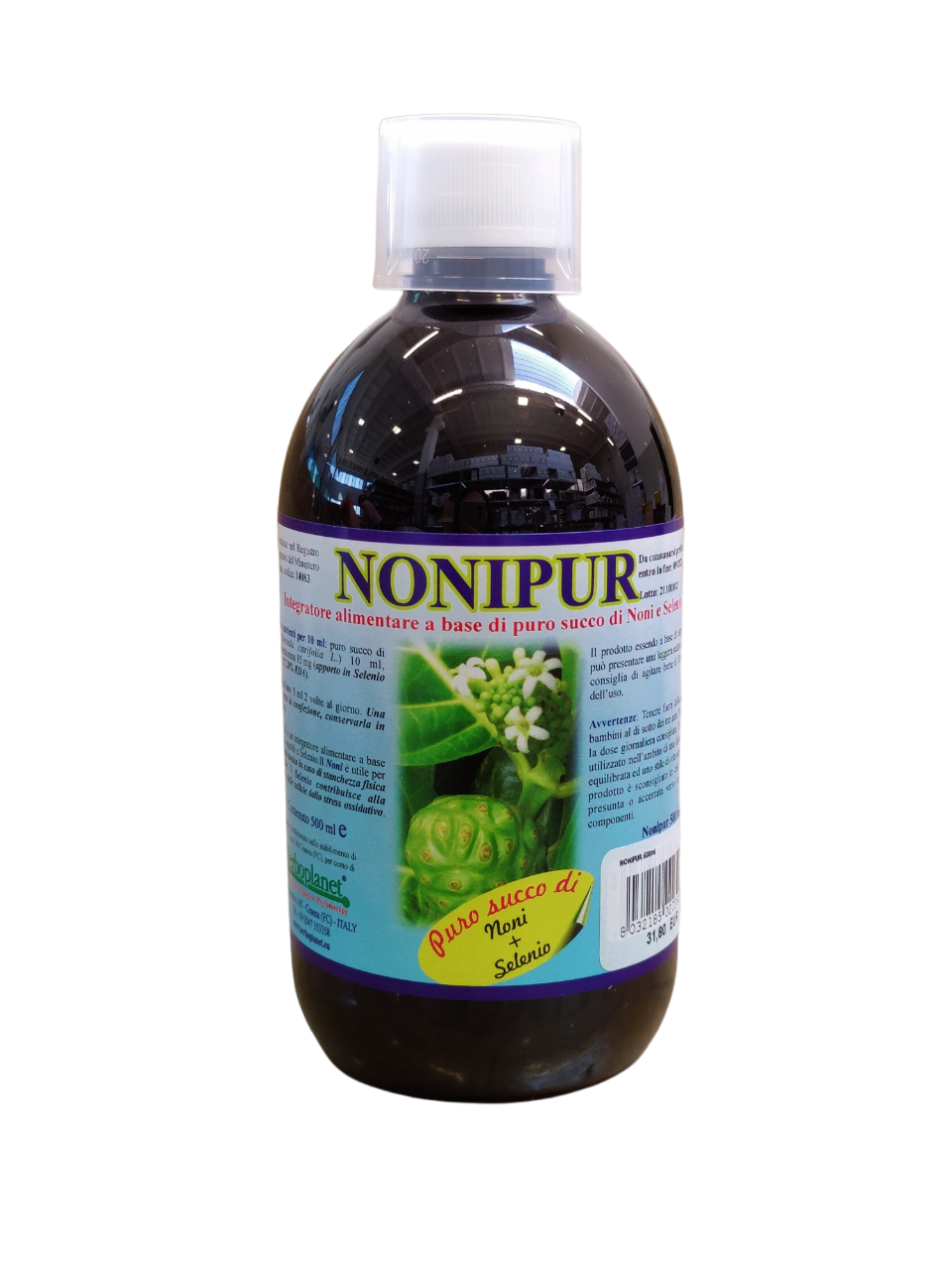 APPORTO INGREDIENTI PER 10 ml: puro succo di Noni (Morinda citrifolia L.) 10 ml, L-Selenometionina 15 mg (apporto in Selenio 70 μg = 127,28% VNR).